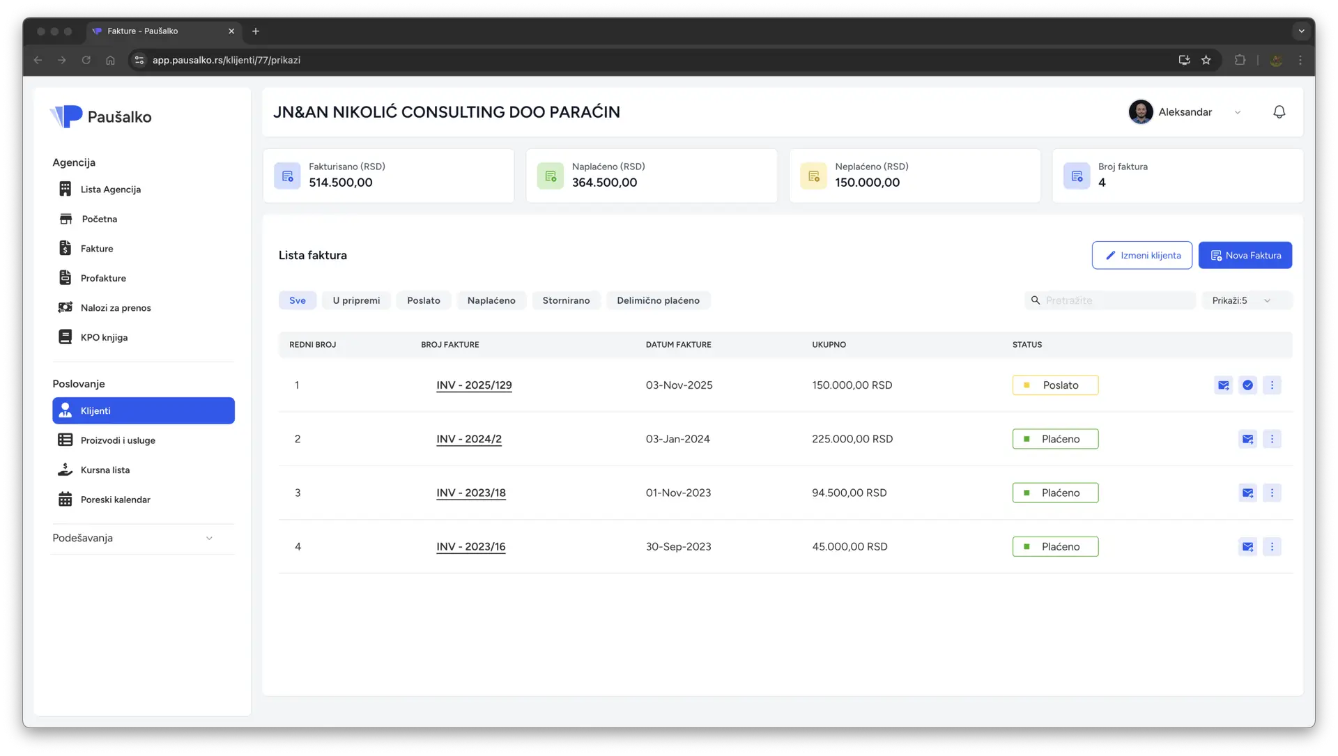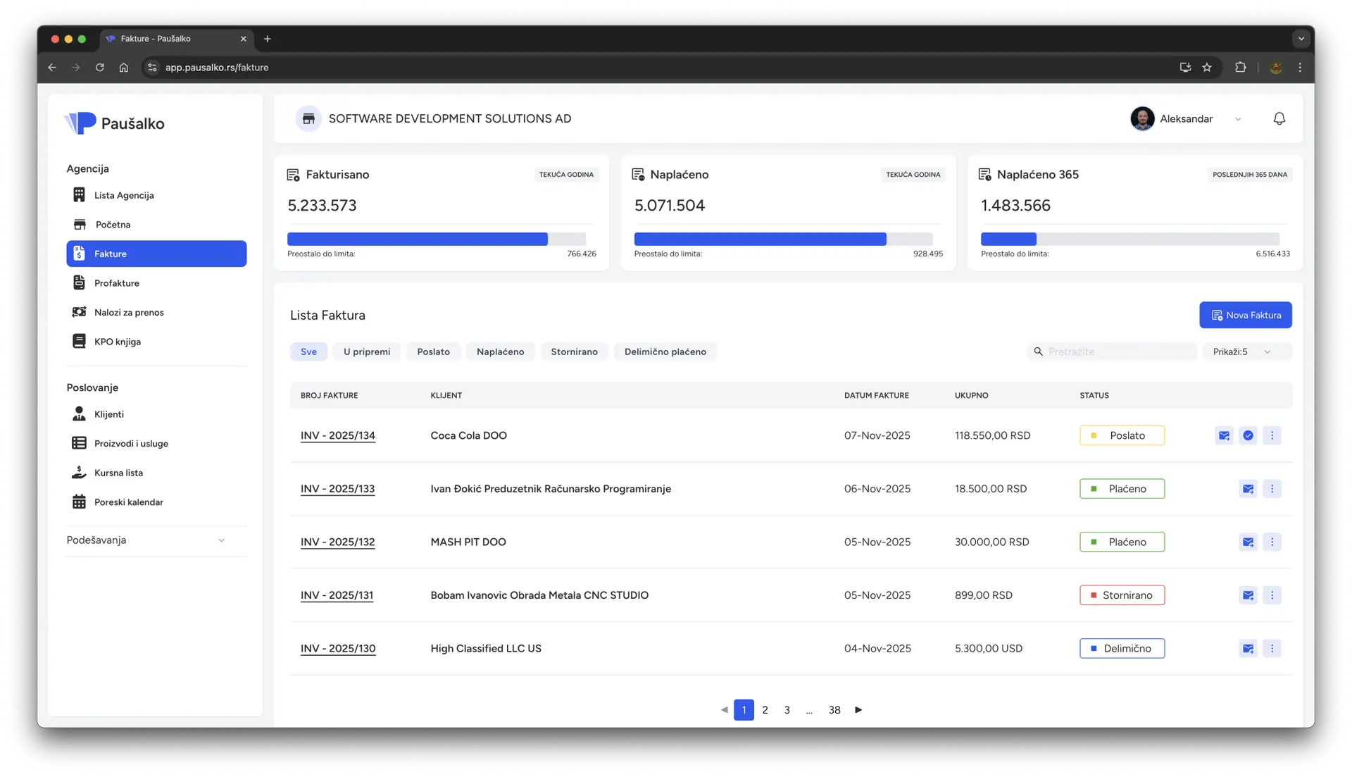 OДЛИЧНО На основу 7 рецензије Објављено на SaleTrustindex потврђује да је оригинални извор рецензије Google. Pausalko je vrhОбјављено на Nikola LazicTrustindex потврђује да је оригинални извор рецензије Google. Sasvim zadovoljavajuca usluga, svaka cast, nema greske!!!Објављено на Stefan SerafimovicTrustindex потврђује да је оригинални извор рецензије Google. Posebno mi se dopada što je čitav proces pravljenja faktura brz i jednostavan, a sistem je toliko pouzdan da do sada nisam imao potrebu da kontaktiram korisničku podršku. Paušalko zaista štedi moje vreme i olakšava svakodnevne poslovne aktivnosti, što ga čini nezamenjivim alatom u mom radu. Toplo ga preporučujem svima koji žele efikasnost i miran rad bez komplikacija!Објављено на Milan BakicTrustindex потврђује да је оригинални извор рецензије Google. Kao paulacu, bilo mi je potrebno jednostavno resenje, za pracenje limita, slanje faktura, pausalko je bas to ponudio. Jednostano, brzo i efikasno, lista korisnika, slanje faktura, i limiti na dohvat ruke. Preporuka za servis. 👍Објављено на Aljoša ĐurasovićTrustindex потврђује да је оригинални извор рецензије Google. Paušalko je baš po meri. Pregledno, maksimalno jednostavno za korišćenje a i navigacija je dobro napravljena, tako da će se svaka osoba snaći. Od pregleda klijenata, faktura, izgleda fakture koja dolazi klijentima, obaveštenja kako za mene tako i za klijente. Važno mi je da na pravljenje faktura i praćenje svega ne trošim mnogo vremena, a da sve uvek bude kako treba - sa Paušalkom nisam imao potrebu ni jednom da kontaktiram podršku - gde ćeš lepše :)