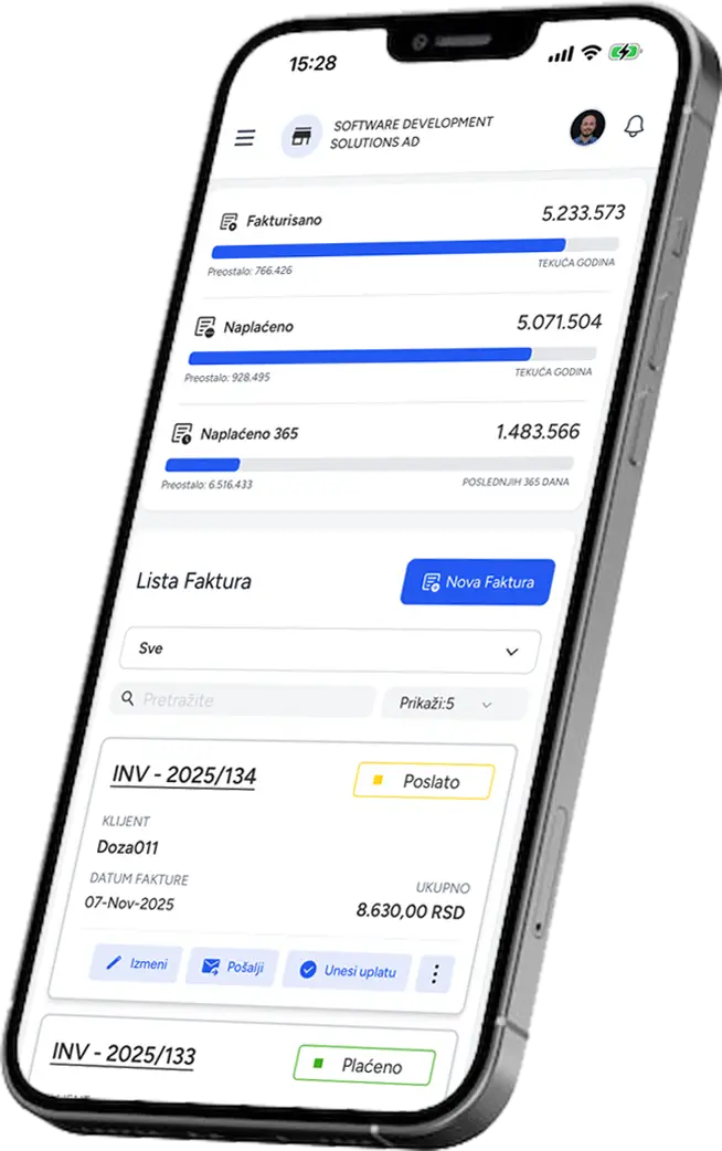 Napravi i pošalji fakturu u samo par klika. Sa intuitivnim korisničkim interfejsom i sveobuhvatnim funkcionalnostima, možete lako pregledati, čuvati, menjati i kopirati svoje fakture. Sve informacije o fakturama se automatski beleže i čuvaju za kasniju referencu, oslobađajući te ručnog beleženja i fizičkog skladištenja informacija o fakturama.